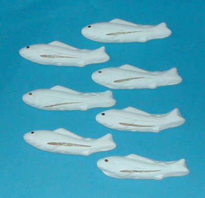 2004年お盆の新作追加,一つだけ見知らぬ形が,右下の2つが一体となったもの,形は大根ですが,下部が朱なのはふしぎ,しかも全体にぶつぶつが……。